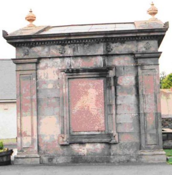 Large neo-classical mausoleum built c.1867 on the site of an earlier family tomb. Rectangular in plan having a base plinth, panelled corner pilasters, pediment and a dentiled entablature with rosette frieze. Acroteria and urn finial to roofline. Central doorway with a shouldered architrave and double-leaf cast-iron door to west elevation. The remaining three elevations carry architraved inscription panels in red polished granite.